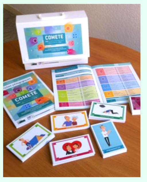 COMETE contient des activités, des fiches méthodologiques et des jeux de carte autour des thématiques suivantes : l’appropriation de la maladie, l’identification et la résolution de problèmes, l’image de soi-les projets de vie-l’avenir, les émotions, le rapport aux autres, l’entourage et les ressources, la confiance en soi (voir la référence).
