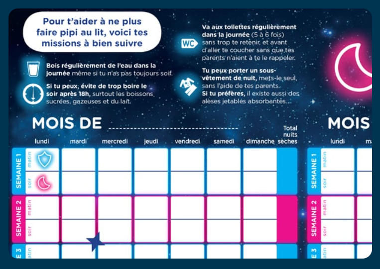 Drynites® met à votre disposition un calendrier ludique et positif du pipi au lit pour aider votre enfant à être autonome, l’objectif est de le responsabiliser au travers de petites missions.
