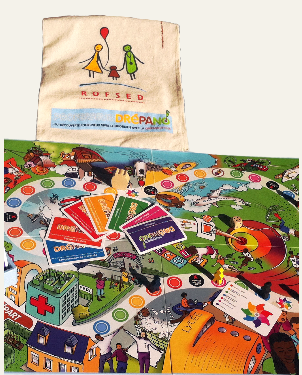 Jeu de plateau sur une toile de 1m par 1 m permettant d’explorer les connaissances des enfants de 6 à 9 ans sur leur maladie, les mesures de prévention au quotidien.