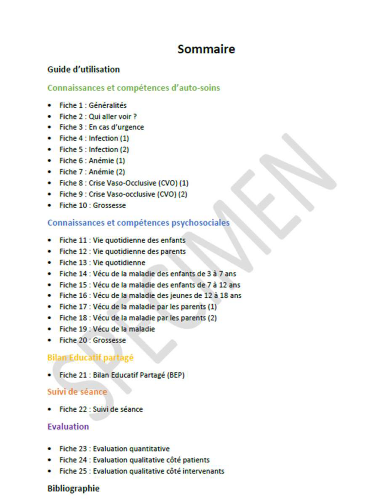- Mise à disposition de trames « classiques » des séances ETP-thalassémie du centre qui pourront être intégrées tout ou partie dans des programmes déjà existant en particulier ceux développés pour la drépanocytose;
